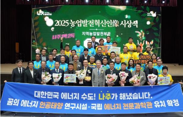 [중앙뉴스라인, 김민수기자] 전라남도 나주시가 농업 경쟁력 강화와 농업소득 증대를 위한 지속적인 정책 추진 성과를 인정받아 농협중앙회가 주관한 ‘2025 농업발전 혁신인상’ 지역농업발전부문 수상기관으로 선정됐다.