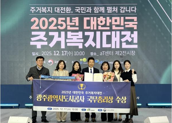 광주도시공사(사장 김승남)는 17일 서울 양재 aT센터에서 열린 ‘2025 대한민국 주거복지대전’에서 주거복지 향상 및 서민 주거안정에 기여한 공로를 인정받아 국무총리 표창을 수상했다고 밝혔다.