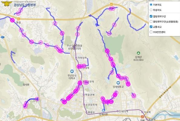 지역별로는 ▲김해시 27개 구간 165건, ▲진주시 8개 구간 35건, ▲합천군 13개 구간 18건 순으로 출동이 많았다. 이들 지역은 하천 인접 도로, 그늘진 곡선 구간, 교량 등 결빙 발생 가능성이 높은 대표적 위험지대로 분석된다.