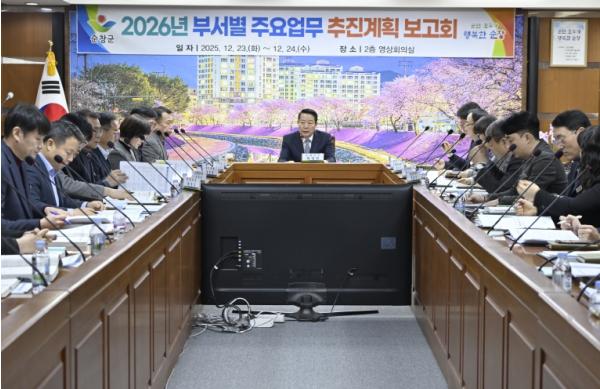 [중앙뉴스라인, 김용범기자] 순창군은 지난 23일부터 24일까지 이틀간 영상회의실에서 최영일 군수 주재로 부군수, 국장, 실·과·소장 및 팀장이 참석한 가운데 2026년 부서별 주요업무 보고회를 개최했다고 밝혔다.