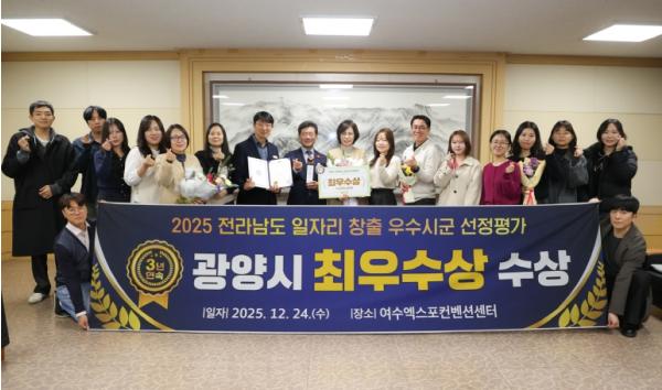 시 관계자는 “이번 수상은 산업위기 속에서도 시민과 기업, 행정이 함께 힘을 모아 이뤄낸 값진 성과”라며, “광양시는 청년이 머물고 기업이 성장할 수 있는 지속 가능한 일자리 정책으로 지역 경제에 활력을 불어넣고, 시민 모두가 체감할 수 있는 고용 안정을 실현해 나가겠다”고 말했다.