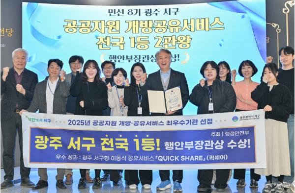 [중앙뉴스라인, 김민수기자] 광주광역시 서구의 생활밀착형 공유정책 ‘천원 피크닉’이 전국 무대에서 주목받았다. 서구는 행정안전부가 주관한 ‘2025년 공공자원 개방·공유서비스 실적평가’에서 전국 최우수 기관으로 선정돼 행정안전부 장관상을 수상했다고 29일 밝혔다.