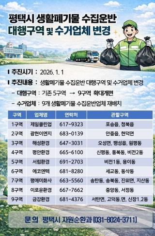 이번 개편은 1995년 평택시·송탄시·평택군 통합 이후 유지돼 온 기존체계를 변경하는 것으로, 더 촘촘한 수거망 구축과 신속한 청소 민원 대응을 위해 추진된다.