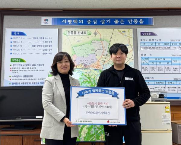 이은영 읍장은 “관내 어려운 이웃을 위해 나눔을 실천하는 안중JMC줄넘기체육관 관장님과 아이들의 따뜻한 마음에 깊은 감사를 드린다.”라며, “후원해주신 라면과 즉석식품은 지역사회 내 필요한 이웃들에게 잘 전달하겠다.”라고 전했다.