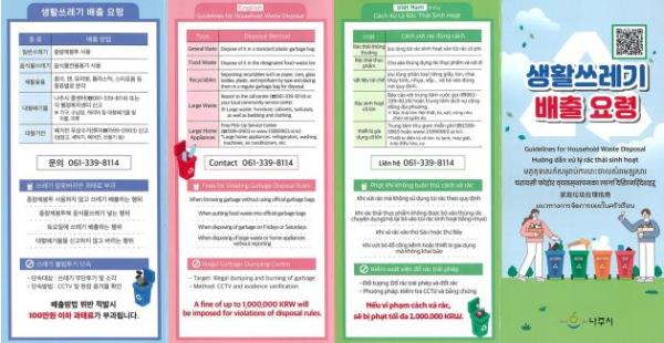[중앙뉴스라인, 김민수기자] 외국인 거주자와 근로자가 생활폐기물 배출 방법을 쉽게 이해하고 올바르게 실천할 수 있도록 나주시가 다국어 홍보물을 제작해 무단투기 예방과 쾌적한 도시환경 조성에 나선다.