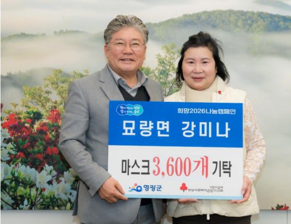 [중앙뉴스라인, 김민수기자] 영광군은 2025년 12월 30일 묘량면에 거주하는 강미나 씨가 어려운 이웃들에게 전달해달라며 마스크 3,600개를 기탁해 희망2026나눔캠페인에 동참했다고 밝혔다.