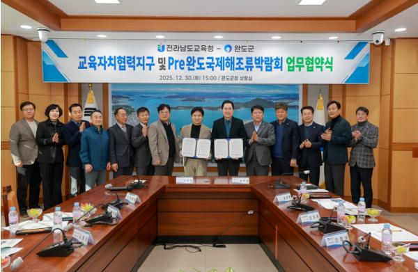 [중앙뉴스라인, 이상권기자] 완도군은 지난해 12월 30일 전라남도교육청과 교육자치협력지구의 원활한 사업 운영과 2026 Pre완도국제해조류박람회 협력 체계 구축을 위한 업무 협약을 체결했다.