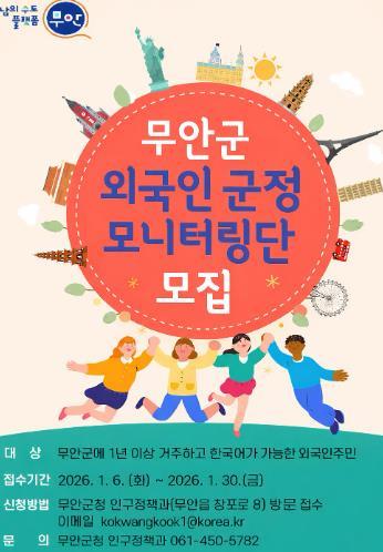 [중앙뉴스라인, 이상권기자] 무안군은 외국인주민의 안정적인 지역 정착과 사회통합을 위해 2026년 '외국인주민 군정 모니터링단'을 신규 모집한다고 밝혔다.