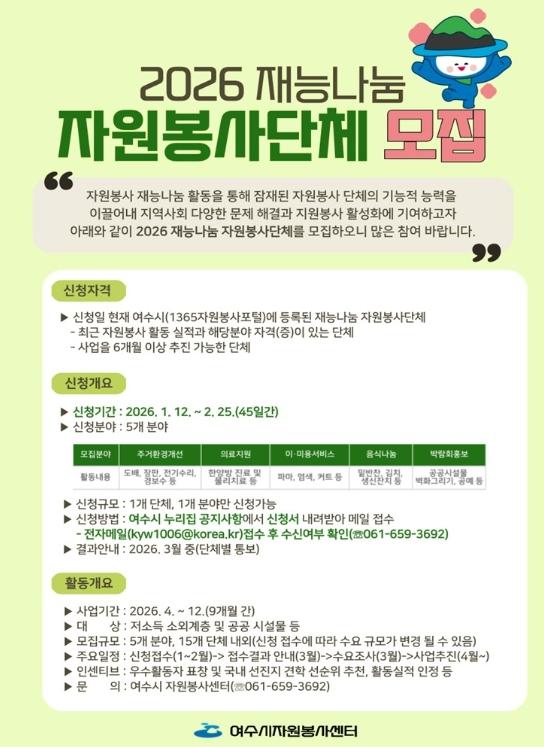 [중앙뉴스라인, 전은희기자] 여수시는 오늘(12일)부터 오는 2월 25일까지 ‘2026년 찾아가는 재능나눔 프로그램’에 참여할 자원봉사 단체를 모집한다.