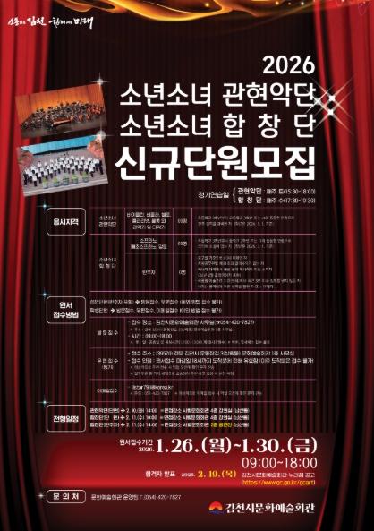 [중앙뉴스라인, 우제헌기자] 김천시 문화예술회관은 김천 문화예술의 미래를 이끌어 갈 시립예술단 신규단원을 모집한다.
