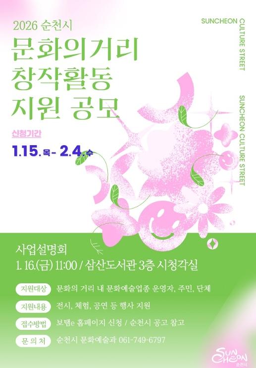 [중앙뉴스라인, 전은희기자] 순천시는 문화의 거리를 예술특화 거점지역으로 육성하고 지역 예술인의 지속가능한 창작활동을 지원하기 위해 ‘2026년 순천시 문화의 거리 창작활동 지원사업’ 참여자를 공개 모집한다고 밝혔다.