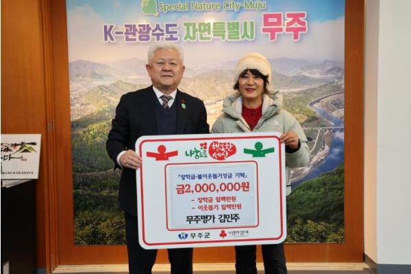 [중앙뉴스라인, 김용범기자] 무주군 무주읍에 위치한 한식 전문점 ‘무주명가’의 김민주 사장이 지난 14일 무주군에 이웃돕기 성금 1백만 원, (재)무주군교육발전장학재단에 장학금 1백만 원 등 총 2백만 원을 기탁했다.