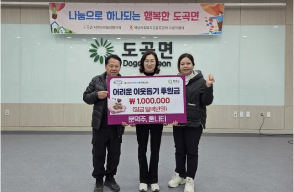 [중앙뉴스라인, 전은희기자] 도곡면은 지난 14일 관내에 거주하는 문덕주·혼나티 부부가 지역 내 어려운 이웃을 위해 100만 원을 도곡면 지역사회보장협의체에 기부했다고 밝혔다.