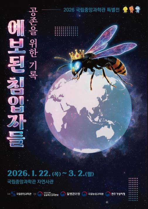 [중앙뉴스라인, 한장원기자] 미래의 꿈을 만드는 과학기술 문화 이음터(플랫폼) 과학기술정보통신부 국립중앙과학관은 1월 22일부터 3월 2일까지 자연사 관에서 인공지능(AI) 기술을 활용해 다양한 기후변화에 따른 해충의 위협과 슬기로운 대응을 다룬 해충특별전 ‘2026년 예보된 침입자들: 공존을 위한 기록’을 개최한다고 밝혔다.