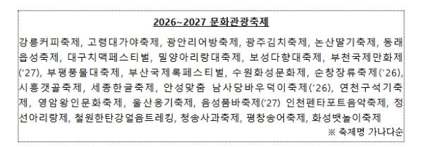 ‘2026~2027 문화관광축제’는 지난 2년간 전문가와 소비자, 지역주민 평가 결과와 바가지요금 등 부정적 문제 여부, 수용 태세 등을 종합적으로 고려해 선정했다.