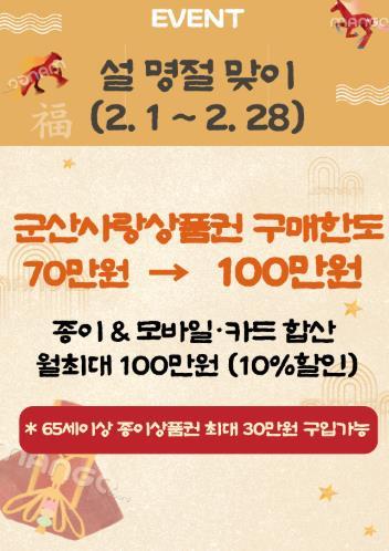 [중앙뉴스라인, 김용범기자] 군산시가 설 명절을 맞아 2월 한 달간 군산사랑상품권의 1인당 월 구매 한도를 기존 70만 원에서 100만 원으로 한시적으로 전격 상향한다고 26일 밝혔다.