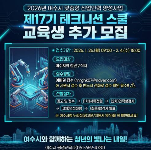 [중앙뉴스라인, 전은희기자] 여수시가 지역 산업 수요에 맞는 전문 인력을 양성하기 위해 추진하는 ‘2026년 여수시 맞춤형 산업인력 양성사업’의 일환인 '테크니션 스쿨 제17기' 교육생을 추가 모집한다고 밝혔다.