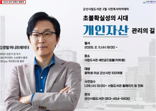 [중앙뉴스라인, 김용범기자] 군산시립도서관은 오는 2월 11일 저녁 7시 최근 방송과 유튜브에서 ‘돈쭐남(돈으로 혼쭐내는 남자)’으로 큰 인기를 얻고 있는 김경필 머니트레이너를 초청해 ‘초불확실성의 시대: 개인 자산 관리의 길’을 주제로 특별 강연을 개최한다고 밝혔다.
