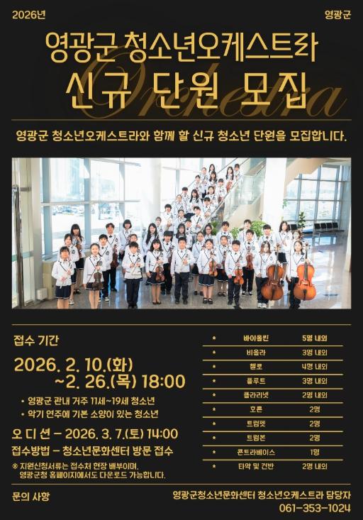 [중앙뉴스라인, 전은희기자] 영광군은 지역 청소년들의 문화예술 역량 강화와 건전한 성장을 지원하기 위해 ‘2026년 영광군 청소년오케스트라 신규 단원’을 모집한다고 밝혔다.