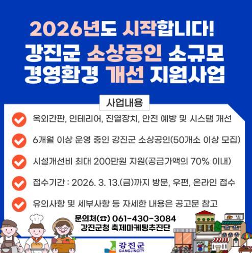 [중앙뉴스라인, 전은희기자] 강진군이 지역 소상공인의 영업환경 개선과 경영 안정화를 돕기 위해 노후화된 시설을 맞춤형으로 개선할 수 있는 지원사업을 모집한다.