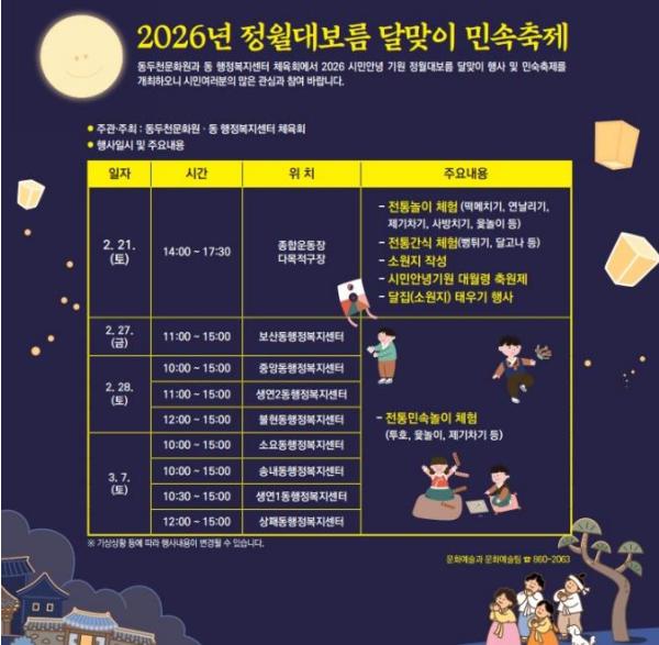 [중앙뉴스라인, 우제헌기자] 동두천시는 2026년 정월대보름(양력 3월 3일)을 맞아 동두천문화원과 각 동 체육회에서 2026년 정월대보름 달맞이 전통 민속행사를 개최한다고 밝혔다.