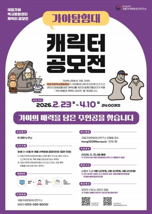 이번 공모전은 국민과 함께 만든 캐릭터를 통해 가야역사문화의 거점 기관인 국립가야역사문화센터의 정체성을 더욱 친근하게 전하고자 ‘가야 탐험대, 캐릭터 공모전’ 이라는 주제로 진행되며, 선정된 캐릭터는 향후 국립가야역사문화센터의 각종 홍보물과 교육 프로그램, 문화상품 제작에 활용되면서 국민과의 소통창구로 운영될 예정이다.