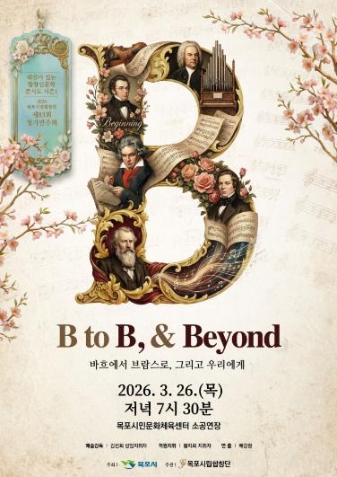 목포시립합창단(예술감독 겸 상임지휘자 김선희)이 오는 3월 26일 오후 7시 30분, 목포시민문화체육센터 소공연장에서 제83회 정기연주회 'B to B & Beyond(Bach to Brahms) : 해설이 있는 합창인문학콘서트 시즌1'을 개최한다.
