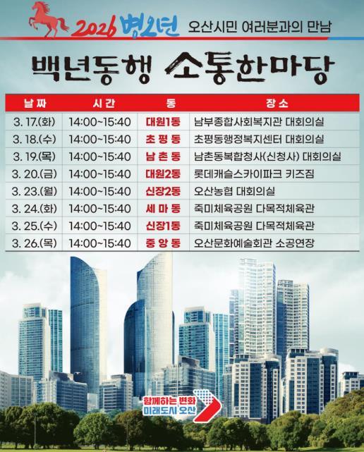 [중앙뉴스라인, 우제헌기자] 오산시가 시민과 직접 만나 시정 운영 방향을 공유하고 지역 현안을 듣는 ‘2026 백년동행 소통한마당’을 개최한다.