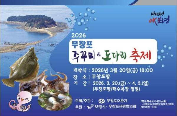 [중앙뉴스라인, 우제헌기자] 보령의 대표 수산물 축제인 ‘2026 무창포 주꾸미&도다리 축제’가 제23회를 맞아 3월 20일 개막식을 시작으로 4월 5일까지 17일간 무창포항·해수욕장 일원에서 펼쳐진다.