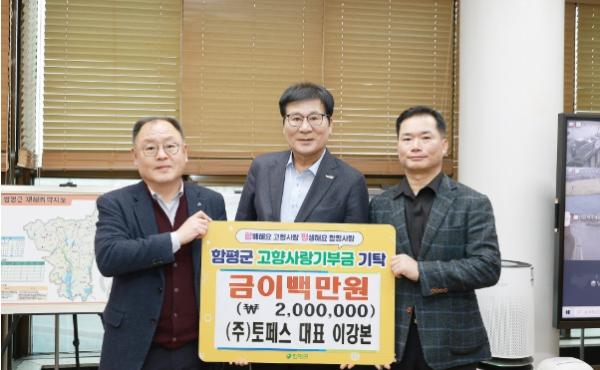 함평군은 18일 “㈜토페스 이강본 대표가 고향사랑e음을 통해 함평군에 온라인 기부를 실천했다”고 밝혔다.