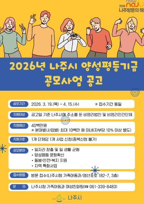 [중앙뉴스라인, 김민수기자] 전남 나주시가 일·생활 균형과 양성평등 문화 확산, 돌봄과 안전 복지 지원을 위한 ‘2026년 나주시 양성평등기금 공모사업’을 추진한다.