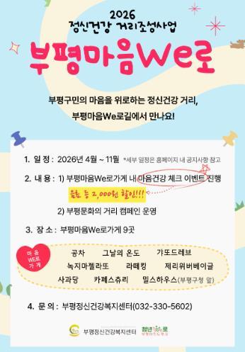 부평정신건강복지센터, ‘2026년 정신건강 거리조성사업-부평마음We로(路)’ 운영