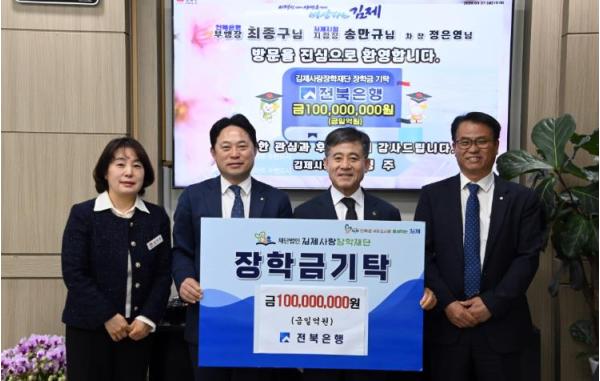 이날 기탁식에는 김제사랑장학재단 정성주 이사장을 비롯해 전북은행 최종구 부행장, 송만규 김제지점장, 정은영 차장 등이 참석해 지역 인재들을 위한 희망의 메시지와 함께 장학금을 전달했다.
