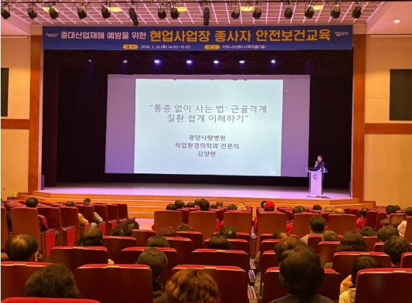 이번 교육은 사업장에서 발생할 수 있는 위험요인을 사전에 관리하고 직업성 질병을 예방하기 위해 마련됐으며, 광양시 산업보건의로 위촉된 광양사랑병원 직업환경의학과 김양현 원장이 진행한 가운데 2026년 하반기 근골격계 유해요인조사를 앞두고 예방 중심으로 구성됐다.