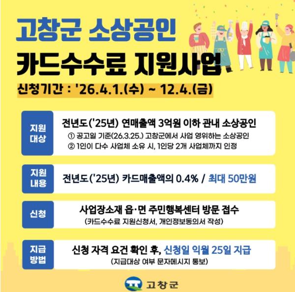 [중앙뉴스라인, 김용범기자] 고창군이 관내 소상공인의 경영 부담 완화를 위해 오는 4월1일부터 예산 소진 시까지 ‘2026년 소상공인 카드수수료 지원사업’을 본격 추진한다고 밝혔다.