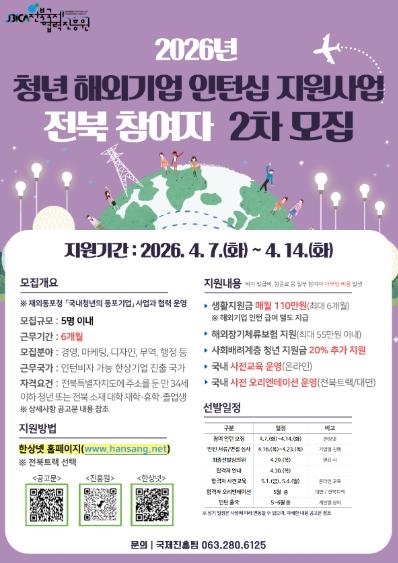 김기수 원장은 “지난 1차 모집에서도 지역 청년들이 많은 관심을 보여주었다. 이번 2차 모집을 통해 더 많은 전북 청년들에게 해외 진출 기회를 제공하고자 한다.”며 “앞으로도 도내 청년들이 글로벌 인재로 성장할 수 있도록 실질적인 지원을 지속적으로 확대해 나가겠다.”고 밝혔다.