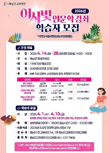 [중앙뉴스라인, 이상권기자] 해남군교육재단은 4월 14일부터 28일까지‘해남 이사빛 인문학 강좌’를 운영한다.‘이사빛’은‘이른 아침 따스하게 비추는 햇빛’을 의미하며 따뜻하고 친근한 인문학의 빛을 전하는 군민 교육과정이다.