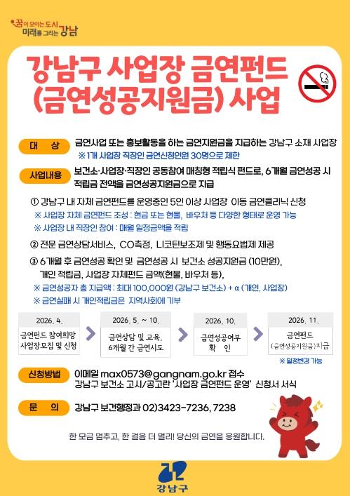 [중앙뉴스라인, 한소연기자] 꿈이 모이는 도시, 미래를 그리는 강남구가 직장인의 자발적인 금연 실천을 유도하고 간접흡연 피해를 줄이기 위해 ‘2026년 사업장 금연펀드’ 참여기업을 모집한다. 보건소와 사업장, 직장인이 함께 금연펀드를 조성하고, 6개월 금연에 성공하면 적립금 전액을 지원금으로 돌려주는 방식이다.