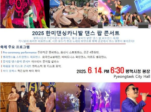 2025 한미댄싱카니발 댄스 팝 콘서트는 경기도 · 평택시가 주최하고, 평택시국제교류재단과 평택문화신문이 공동 주관한다.
