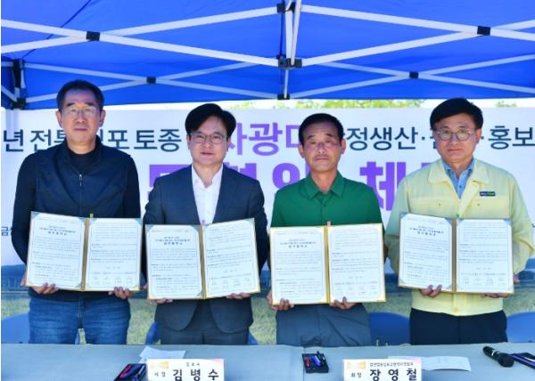 김포시는 지난 12일 대곶면 약암리 874번지에 위치한 농업기술센터 벼 병해충 예찰실증포에서 김포시와 쌀전업농김포금쌀연구연합회, 김포고촌농업협동조합, (재)김포문화재단 등 4개 기관 관계자 등 40여명이 참석한 가운데 김포 토종벼인 ‘자광미’의 안정적 재배와 수매 및 판매, 홍보 및 문화예술활동 전개, 소득화 활성화 지원 등 업무협약을 체결했다. 지자체가 생산주체와 유통판매거점, 문화공공기관과 함께 맞손으로 지자체 농업 발전에 대해 머리를 맞댄 것이다.