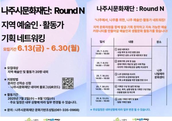 나주시문화재단은 지역 예술인과 문화예술 활동가의 창작 역량 강화와 네트워크 기반 조성을 위한 2025년 지역문화 네트워킹 프로그램 ‘Round N’을 본격 추진한다.