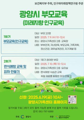 [중앙뉴스라인, 이대수 기자] 광양시가족센터는 7월 9일과 10일 양일간 '2025년 전사회적 인구교육'을 주제로 부모 교육 프로그램을 운영한다고 밝혔다.