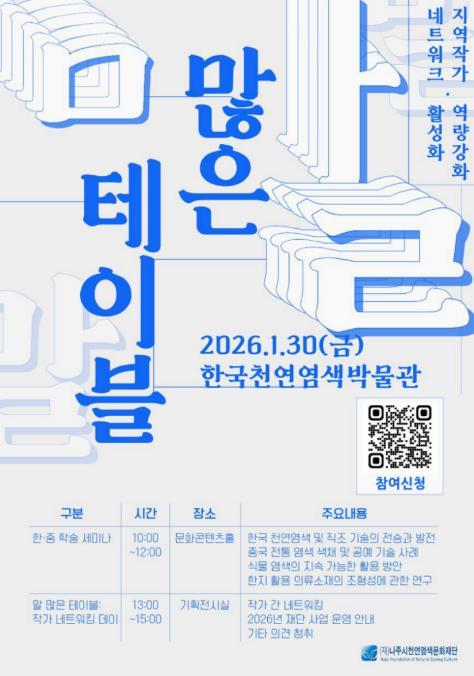 재단은 오는 1월 30일 한국천연염색박물관에서 지역 작가의 전문성 강화와 창작 교류 활성화를 위한 역량 강화 네트워킹 행사 ‘말 많은 테이블’을 개최한다고 23일 밝혔다.