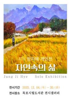목포시립도서관 전시갤러리는 12월 4일부터 30일까지 정지혜 작가의 개인전 ‘자연 속의 삶’을 개최한다.이번 전시는 작가의 독창적인 시선으로 바라본 풍경 속에서 우리 사회의 구성과 사랑을 간접적으로