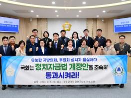 광산구의회가 1일 성명서를 통해 지방의원의 상시 후원회 설치를 가능토록 한 ‘정치자금법 개정안’의 국회 통과를 촉구했다. 먼저 성명서를 통해 “1991년 지방자치제 부활 이후 지방의원들은 지역과 주민