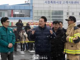 윤석열 대통령은 1월 23일 오후 충남 서천군 특화시장 화재 현장을 방문해 설 대목을 앞두고 피해를 입은 시장 상인들을 위로하고 화재 진압을 위해 고생한 소방관들을 격려했다.강추위 속에 눈까지 내리고