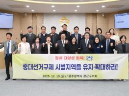 광산구의회가 19일 제301회 정례회 제4차 본회의에서 ‘중대선거구제 시범지역 유지·확대 및 제도 개선 촉구 건의안’을 채택했다. 광산구의회는 김명숙 의원(진보당, 비아동·신가동·신창동)이 대표 발의한
