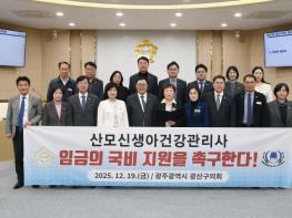 광산구의회가 19일 열린 제301회 정례회 제4차 본회의에서 ‘산모신생아건강관리사 임금 전액 국비 지원 촉구 건의안’을 채택했다. 광산구의회는 조영임 의원(더불어민주당, 첨단1·2동)이 대표 발의한 건의