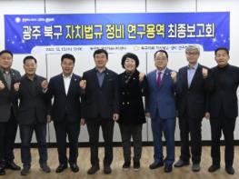 광주 북구의회 의원연구회인 ‘북구의회 자치법규 정비 연구회’가 13일 북구청 여성커뮤니티센터에서 연구용역 최종보고회를 개최하고 연구활동을 마무리했다고 밝혔다.지난 7월 주순일 대표의원을 비롯해