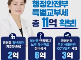 경기 광명갑 임오경 의원(더불어민주당)이 광명동 청년공간(제2청년동) 조성 2억원, 철산동 단독필지 노후 하수관로 정비공사 6억원, 광명전역 주민 생활안전 CCTV설치 사업 3억 등 총 11억원의 2023년 하반